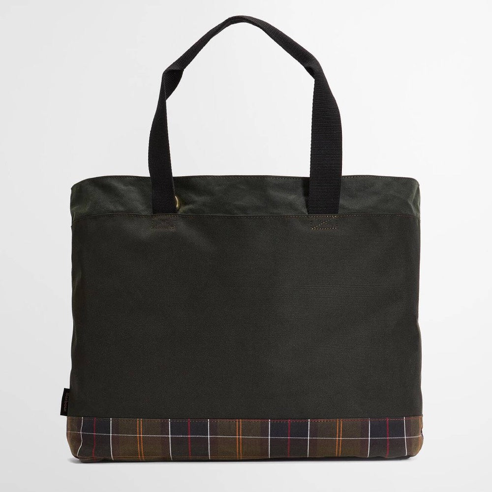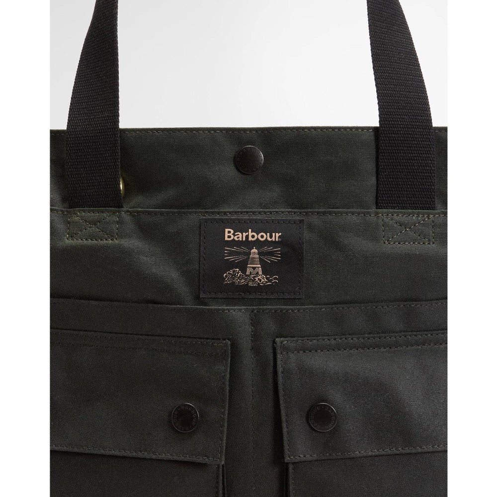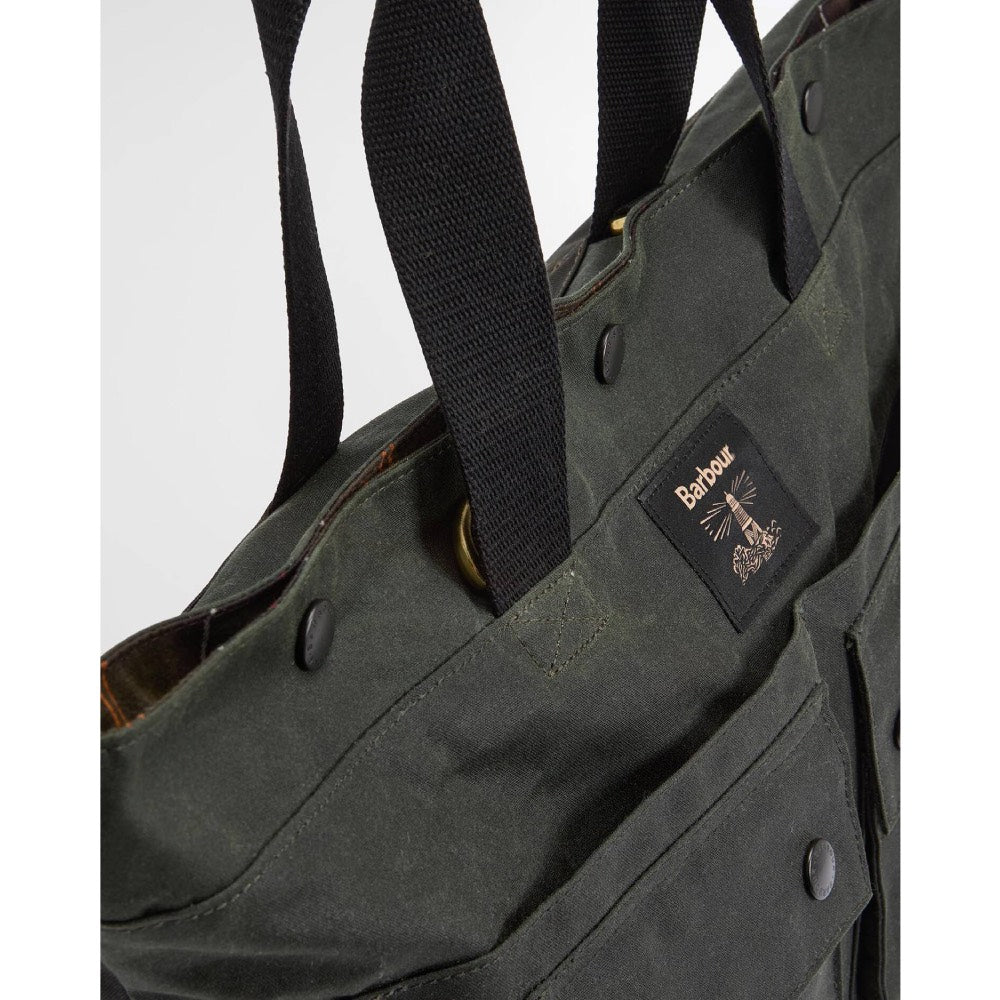 The Barbour Field Wax Tote Bag offers a robust and stylish solution for carrying your everyday essentials. Crafted from durable 10oz waxed cotton canvas this tote bag is built to withstand the elements. It features a secure stud closure to keep your belongings safe. The sturdy webbing grab handles allow for comfortable hand carrying, while a detachable webbing shoulder strap offers versatile carrying options. The base of the bag is trimmed with Barbour's signature tartan, adding a touch of iconic British heritage. The two prominent Barbour jacket-style outer pockets, providing convenient and accessible storage for smaller items. This spacious tote is perfect for shopping, work, or weekend outings.