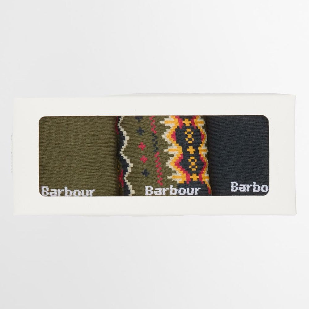 Three pairs of Barbour socks presented in a branded gift box featuring a pair of Fairisle inspired design and two pairs of plain with contrast heel and toe.